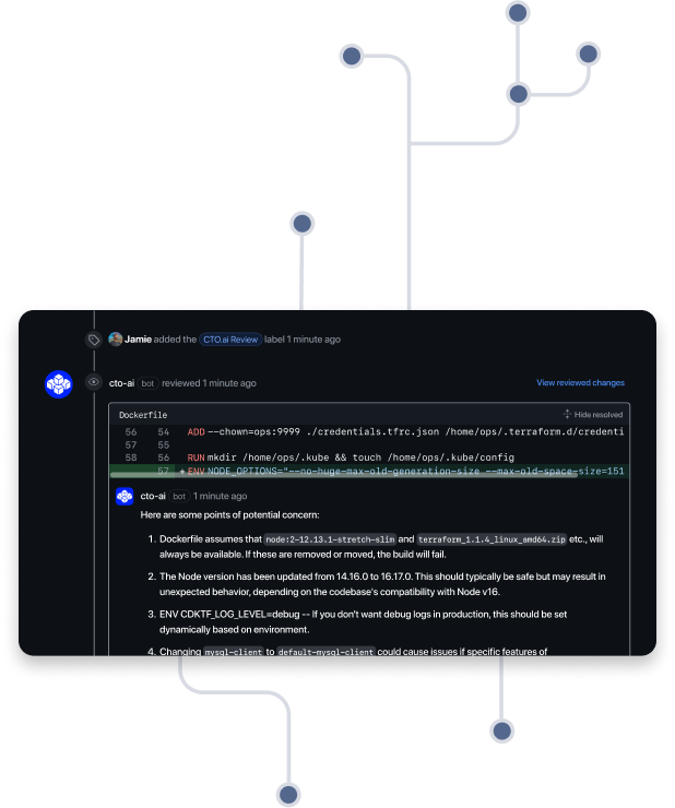 Instead of waiting hours or days for a busy team member to context switch and comment “LGTM” so that you can deploy, harness the power of our AI to provide an instant, in-depth review by simply adding a label to a PR integrated with CTO.ai.